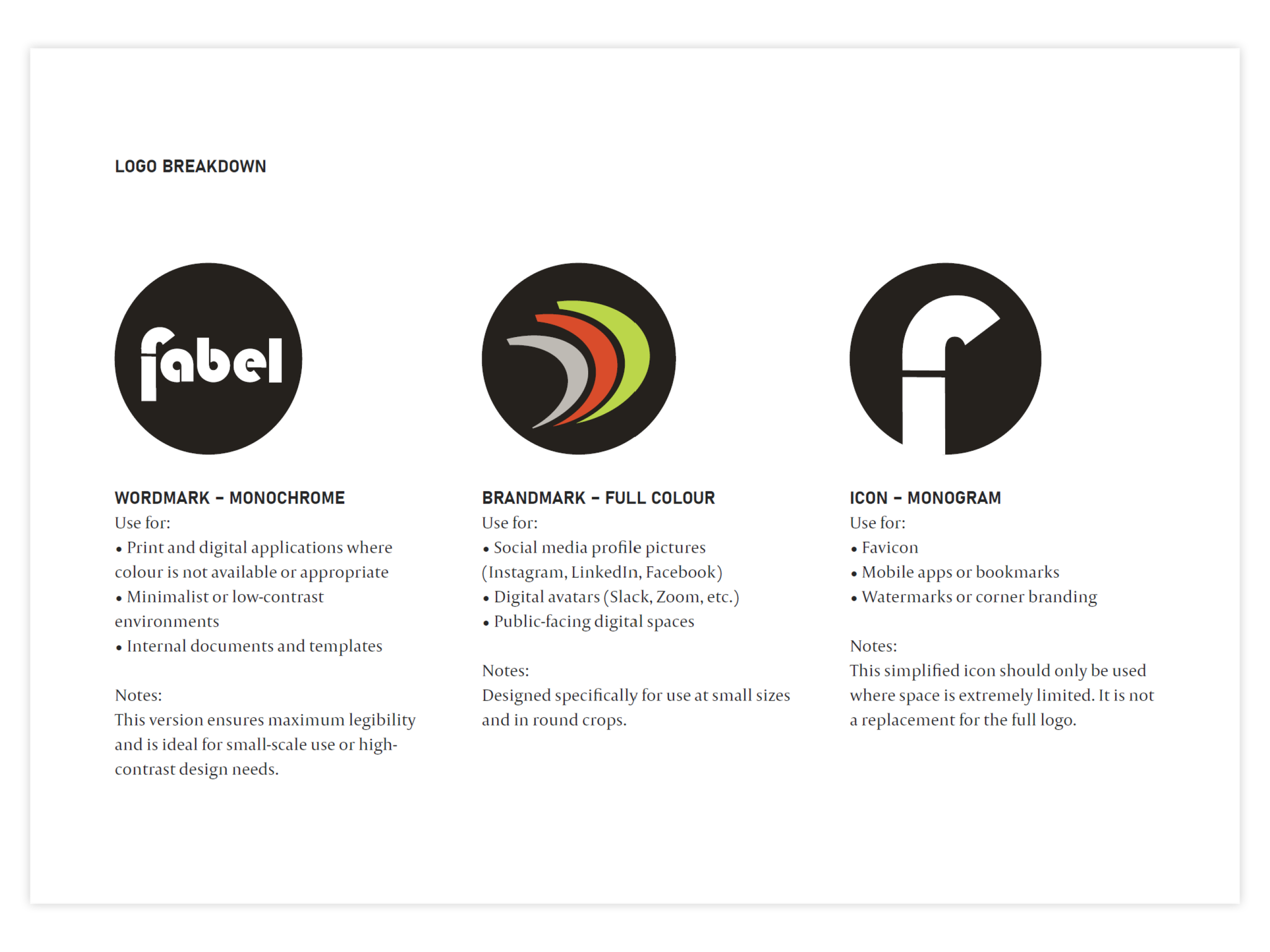 The system works in full colour, monochrome and small-scale contexts, ensuring Fabel remains consistent wherever it appears.